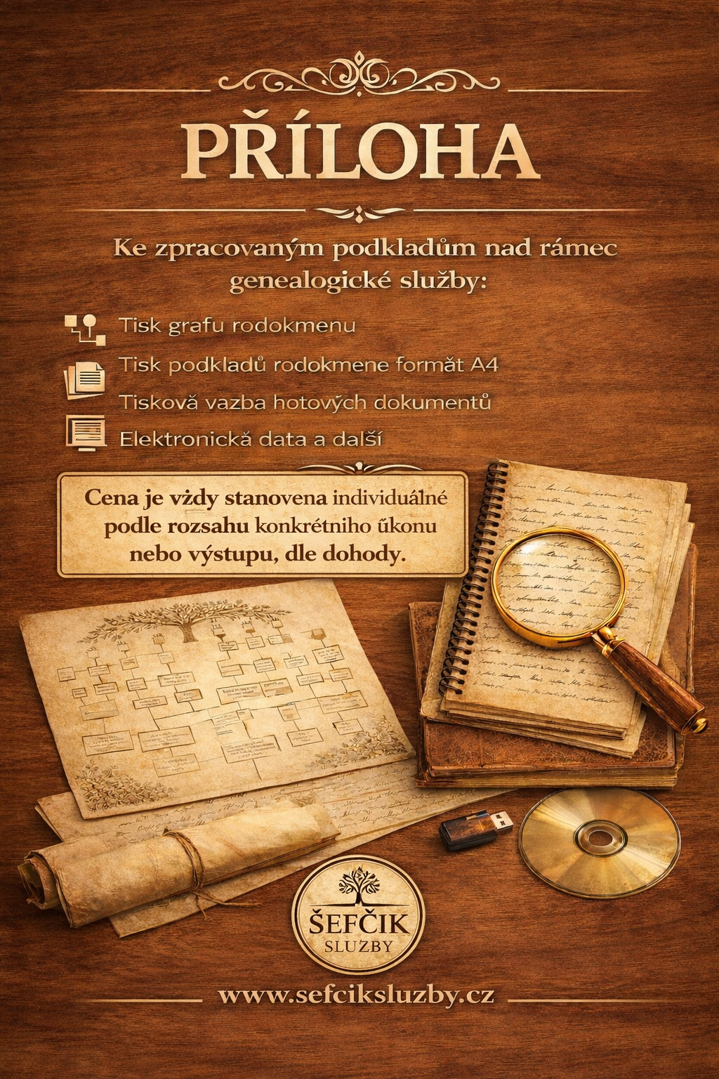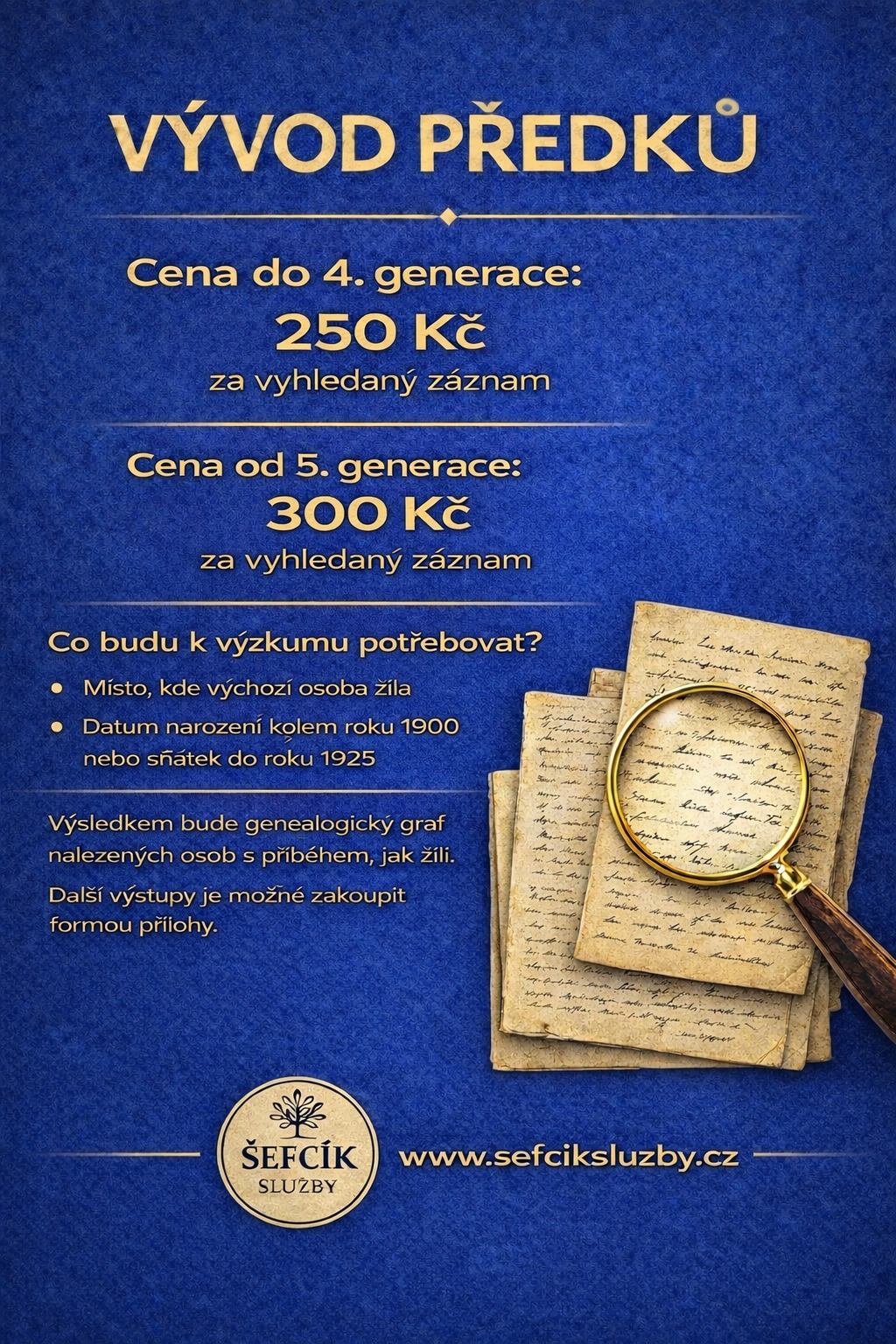 Vítejte na stránkách sefciksluzby.cz, které jsou především věnovány genealogii, rodinné historii a zpracování rodokmenů. Nabízím systematické genealogické bádání, práci s archivními prameny a přehledné zpracování rodových linií s důrazem na historické souvislosti a ověřitelnost údajů.